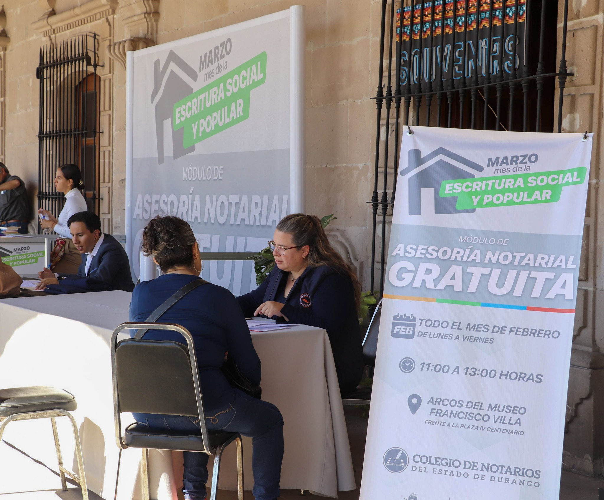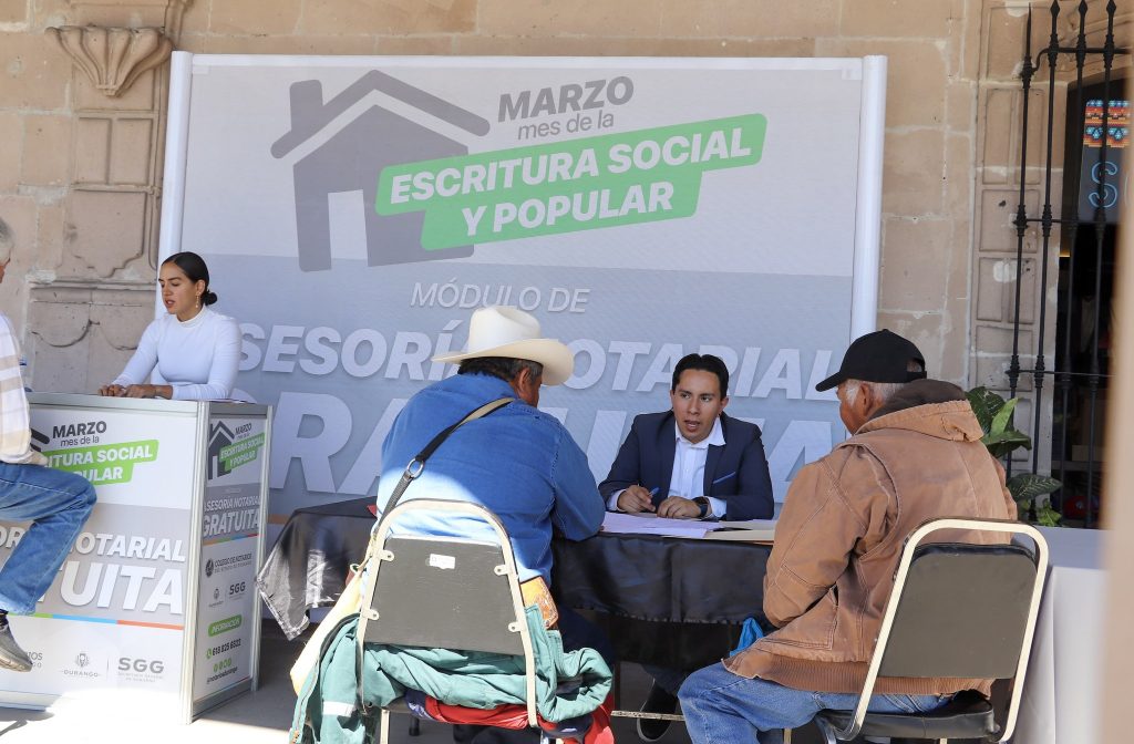 En un esfuerzo conjunto entre la Secretaría General de Gobierno y el Colegio de Notarios del Estado de Durango, se instaló un Módulo de Asesorías Notariales Gratuitas, como parte de las acciones previas al arranque del programa “Marzo, mes de la escritura social y popular”, que tiene como objetivo acercar a las y los ciudadanos servicios notariales de manera accesible, brindando orientación y acompañamiento legal en materia de regularización de inmuebles de interés social y popular.